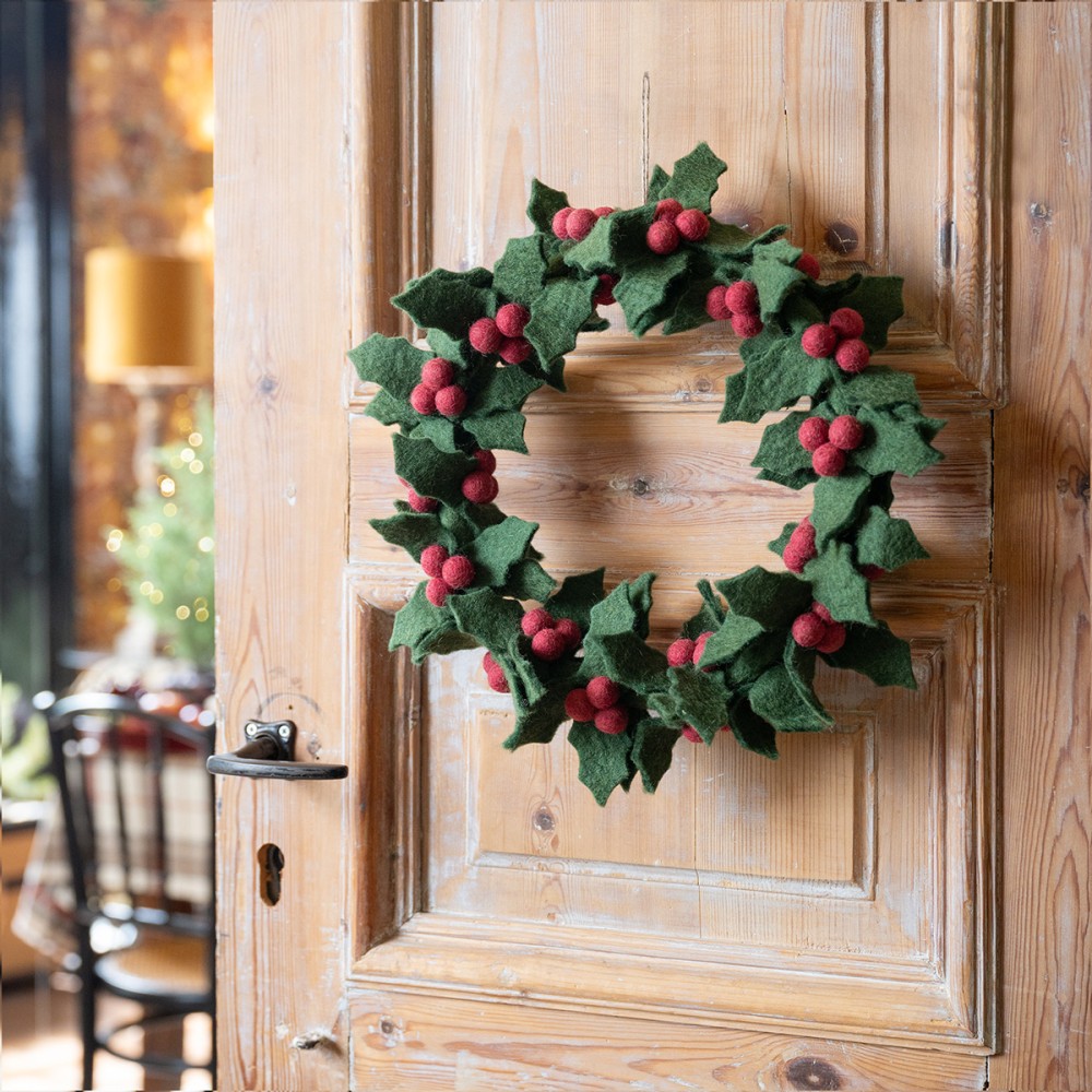 Een krans met een metalen ring en volledig gevuld met vilten hulstblaadjes en rode besjes.
