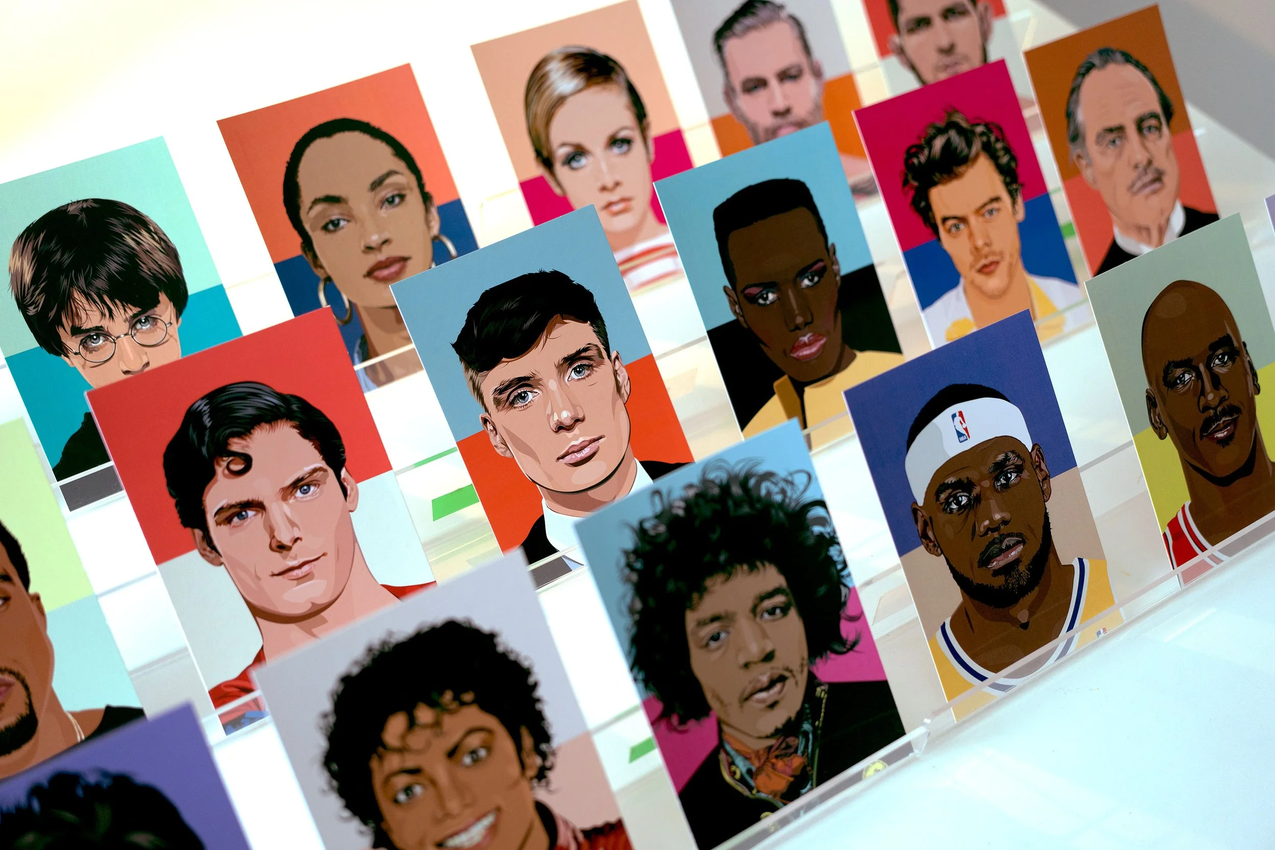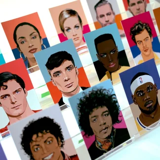 1- Andy Warhol, 2- Audrey Hepburn, 3- Brad Pitt, 4- Daniel Craig, 5- Eddie Murphy, 6- Elisabeth Taylor, 7- Frida Kahlo, 8- George Clooney, 9- Harry Potter, 10- Marilyn Monroe, 11- Neo, 12- Pablo Picasso, 13- Rocky Balboa, 14- The Godfather, 15- Thomas Shelby, 16- Superman, 17- Keanu Reeves, 18- Eminem, 19- Elvis
